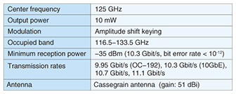4. Future developmentsTo increase the transmission range and carrier-to-noise ratio of future wireless links, we hope to increase the transmitter power and receiver sensitivity. We will also study communications methods and develop new devices and system designs to increase channel capacity. We would also like to advance the analysis of the propagation characteristics of 120-GHz-band, millimeter-wave signals, particularly their weather dependency, by utilizing data from long-term, continuous transmission tests. AcknowledgmentThis research was partially done under an MIC contract under the “RF Resource Use R&D” initiative. References