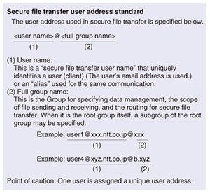The NTT Information Sharing Platform Laboratories has been working on the development of a Scalable Secure File Sharing System (SSS) [1] since 2005. This service can send and receive files as large as 100 GB with authentication of the sending and receiving users, encryption of the transmitted data, and restriction of recipients to a closed transmission path. All this is done transparently as far as users are concerned (Fig. 2). To implement secure file transfer for NTT Group companies and their clients, we collaborated with NTT Communications and NTT Comware to develop the “occrue” service. In this article, we describe the service, its special features, and the sharing rules.