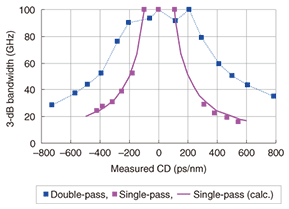 The relationship between the dispersion setting and the 3-dB transmission bandwidth is summarized in Fig. 6. With the single-pass TODC, as expected, the relationship followed the theoretical limitation, namely the bandwidth was inversely proportional to the CD. On the other hand, the bandwidth of the double-pass TODC was wider than that of the conventional one. However, we observed a slight degradation in the bandwidth, which should have remained constant regardless of the CD setting. We think that this bandwidth degradation was induced by some misalignment of the optics such as torsion of the cylindrical lenses that were glued to the PLCs. This misalignment could have prevented the steered beam from coupling efficiently with the second AWG. From a practical viewpoint, the double-pass TODC was able to achieve a CD value of ±400 ps/nm with a 50-GHz bandwidth, which is wide enough for a transmission bitrate of 40 Gbit/s. The insertion losses were 8.8 and 15.2 dB for the single- and double-pass configurations, respectively. By improving the alignment of the optics, we should be able to widen the passband and reduce the insertion loss.