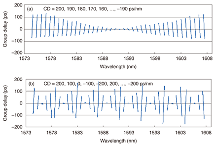1. IntroductionA tunable optical dispersion compensator (TODC) is an indispensable device for a reconfigurable optical add/drop multiplexed (ROADM) network with a high transmission bitrate such as 40 Gbit/s or higher. In such ROADM networks, the transmission length and chromatic dispersion (CD) vary when a routing path is switched at the ROADM node. The TODC offers the adjustability needed to handle such CD changes. TODCs have already been reported using a number of technologies including lattice filters, etalons, fiber-Bragg gratings, and spectrometer-based TODCs [1]–[5]. A conventional TODC compensates for an optical signal with a single CD value, so one TODC is required for each wavelength division multiplexing (WDM) channel to obtain a different compensation value for each channel independently. As shown in Fig. 1(a), this approach is costly because it needs a large number of TODCs. A channelized TODC (Fig. 1(b)), which can set different CD values for different WDM channels independently, is attractive for use in such a system because it reduces the device count as well as the power consumption of the network.