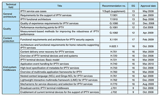 1. Outline of IPTV-GSI activitiesStandardization for IPTV is being conducted at ITU-T (International Telecommunication Union, Telecommunication Standardization Sector). ITU has Global Standards Initiatives (GSIs), which are groups intended to deliberate on discussions spanning multiple Study Groups (SGs). IPTV-GSI [1], which covers six SGs (9, 11, 12, 13, 16, and 17), was established in January 2008 to take over the work already done by FG IPTV (Focus Group on IPTV) [2]. By October 2009, it had held eight meetings. On each occasion, 30–80 contributions were submitted and actively discussed among 60–70 participants. IPTV-GSI has completed 19 Recommendations (including Supplements) and discussed approximately 70 draft Recommendations. The completed Recommendations are shown in Table 1. The ones based on deliverables produced by FG IPTV were close to completion as of December 2009.