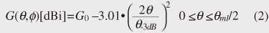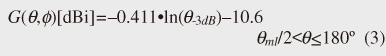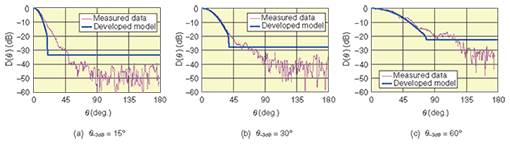 There are two ways to determine the side-lobe level. One way is to consider practical applications. For example, in the case of interference assessments, the design side-lobe level is set a little bit higher than the actual side-lobe level. This provides conservative results for interference analyses. However, the antenna model described in this article is intended for new systems that include PHY/MAC (physical layer, medium access control) specifications. Thus, using this conservative approach may cause significant error because the side-lobe effects depend on the specifications. The other way of determining the side-lobe level is to derive it from physical requirements, i.e., the conservation of energy law. We averaged the power outside the main lobe to obtain a side-lobe level that satisfies the physical requirements. The averaged side-lobe level Gsl can be expressed as ![]() where G0, D(θ, φ), and θml are the peak gain, directivity function normalized by the peak gain, and main-lobe angular width, respectively, and θ and φ are polar coordinates. The second term of the numerator is the total power included in the main lobe. The denominator is the integration over the solid angle outside the main lobe. This expression ensures that the total radiated power i.e., the integration of the antenna pattern, is kept at 4π. To calculate this equation, we must determine G0, D(θ, φ), and θml. Our approach uses, as the directivity function of the main lobe, a Gaussian function of only θ owing to its simplicity. This means that the modeled antenna has a rotationally symmetric beam. G0 is calculated from the theoretical response of the circular aperture antenna, which has a similar main-lobe pattern to the Gaussian beam antenna. θml is determined by the angle at which the main-lobe function decreases by -20 dB from its peak. Equation (1) is not easy to calculate in a system simulation because its integration is difficult to solve analytically. Our solution is to derive an approximate expression using the results of a numerical integration. The developed antenna model is formulated in terms of directivity gain G(θ, φ) as follows: [5] ![]() ![]() where θ-3dB is the antenna¡Çs half-power beamwidth and θ-3dB is in units of degrees. Equations (2) and (3) give the directivity gains of the main and side lobes, respectively. Here, the directivity gain is not a function of φ, which means that the antenna has a rotationally symmetric beam. Antenna patterns calculated using the design model and measured patterns for rectangular horn antennas are shown in Fig. 3. As shown in this figure, the main-lobe patterns of the design model agree well with the measured ones. The side-lobe levels of the model are constant and well approximate the average values of the measured patterns. Thus, the antenna model is effective in millimeter-wave WPAN system design.