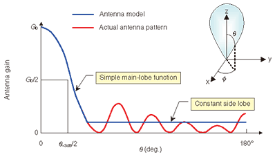 For millimeter-wave WPAN system construction, one must use a directional antenna because of the high propagation loss of millimeter-wave signals and their low transmission power, which is strictly limited by law. The signal power received by the directional antenna is strongly influenced by its antenna pattern and is a significant determiner of system performance. Thus, WPAN system design requires antenna pattern evaluation as well as a channel model. 4. Antenna model for millimeter-wave WPAN system designBeside the regulatory constraints, design goals such as low power consumption also dictate low transmission power for WPAN systems. Since millimeter-wave signals have high propagation loss, the use of a directional antenna is essential. As described in section 3, WPAN systems are usually used in multipath environments, so a system design must consider signals arriving from outside the antenna¡Çs main lobe. The requirements of the antenna model used for WPAN system design are summarized as follows: (1) Model antennas with half-power beamwidths of 15–60°, which are common in WPAN systems. (2) Include side-lobe effects. (3) Cover antenna patterns defined over 360°. (4) Provide a simple mathematical model that simplifies system simulation. Among these requirements, (2) and (3) are unique to WPAN systems because of their use in multipath environments. Many antenna models have been developed and used for the design and evaluation of various wireless systems [2], [3]. Here, we introduce a new antenna model suitable for WPAN system design. The basic concept is shown in Fig. 2. The red line shows the antenna pattern of a typical directional antenna. The blue line shows the antenna pattern of the design model. The horizontal axis plots the angular offset from the direction of antenna peak gain and the vertical axis plots antenna gain. As shown in this figure, the design model has a constant side-lobe level. Actual performance of a designed wireless system depends on room size, room shape, locations and number of obstacles, and transmitter and receiver locations. Hence, system design is performed for several typical cases using statistical channel models [4]. The channel model is created from measured data in some environments and is used to statistically generate signals arriving at the receiver. That is, the generated signals are not exactly identical to real signals. This means that exact side-lobe patterns are unimportant and the averaged side-lobe level is more practical for this application even though the actual antennas do not have constant side lobes.