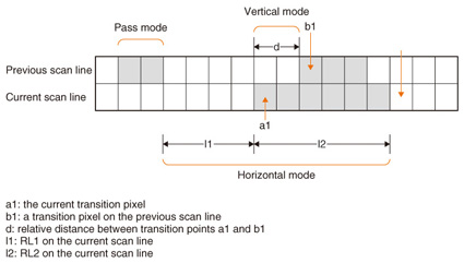 Dr. Yamada talked further about the birth of the MR method: “The READ method was designed to perform coding in either the vertical mode or horizontal mode, whichever needed the least amount of coding bits. By contrast, the MR method, which was adopted as the international standard, simplifies the READ method by performing coding in the vertical mode only for | d | ≤ 3 and in the horizontal mode otherwise, where | d | is the relative distance between transition points a1 and b1. This simplification to the original READ algorithm was submitted as a request, which Japan accepted.”