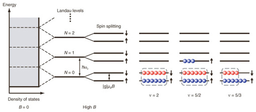 The electron configurations at these filling factors are schematically shown in Fig. 5. When a 2DES is subjected to a strong perpendicular magnetic field B, the cyclotron motion of electrons is quantized and their energy spectrum splits into a set of equally spaced discrete levels (Landau levels) designated by the orbital quantum number N (= 0, 1, 2, ...), with energy separation ħωc, where ωc = eB/m* is the cyclotron frequency (m*: effective mass). Each Landau level is further split into spin-up (↑) and spin-down (↓) levels separated by the Zeeman energy EZ = |g|µBB, where µB = eħ/2me is the Bohr magneton (me: electron mass in vacuum) and g is the g-factor. The ratio of the Zeeman energy to the Landau level separation (m*/me)•|g|/2, which is unity for electrons in vacuum, is significantly reduced in GaAs, by a factor of ~70 owing to the small effective mass m* = 0.067me and the small g-factor (g = –0.44).