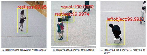 In 2015, NTT Communications developed and evaluated time-series deep learning for analyzing the meaning of time-varying images (video). Normally, when executing image recognition using deep learning, we input pixel values of the input image into a neural network for image recognition (typically using a CNN (convolutional neural network), and the neural network repeatedly updates the weights between layers based on the difference between the calculated prediction results and the actual results. The neural network will continue in this manner in order to acquire an abstract feature to recognize the image. In our work, we dealt with not only the target pixels of the same frame as commonly used but also time information for treating successive frames at once. As a result of this approach, the machine automatically understood what happened in the video with a high degree of accuracy. In consideration of possible real-world use cases such as automatically monitoring a suspicious person or a sick person, we tested this by identifying five types of behavior: leaving an object, restlessness, squatting, standing, and walking, and we were able to identify each behavior using time-series deep learning with approximately 80% accuracy (Fig. 4).