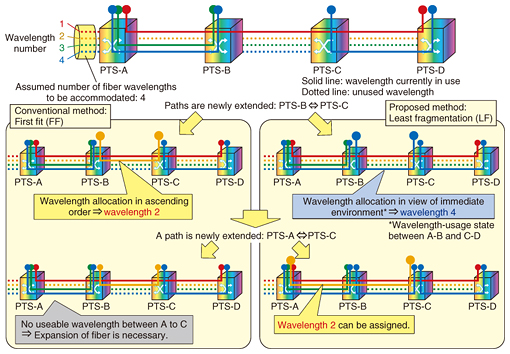 3.1 Batch design for multi-layer pathsWith multi-layers (which mediate both optical paths and electrical paths) as targets, paths are designed in batches. For this batch design, first, optical paths that can accommodate electrical paths are searched for. An optical path is deemed to be a virtual link in the electrical-path layer; a virtual link that can accommodate the bandwidth number of the electrical path is searched for, and candidate routes are selected in order of the fewest number of virtual links passed through. As for the path accommodation design for nodes A’ to Z’ in Fig. 3, candidate routes are selected in order of paths via virtual link 3 and paths via virtual links 1 and 2. In contrast to the previously described example, in cases where there are no optical paths that can accommodate electrical paths, it is possible to design multi-layers as a whole by designing an optical path afresh and designing an electrical path on the virtual links. In addition, the assignment of a wavelength for the optical path at that time is executed by calling the resource-design function block (described below). This function makes it possible to independently design routes in the respective layers for optical and electrical paths. 3.2 Design when source (destination) nodes of primary and secondary paths differPath routes can be designed even if the paths do not have the same source or destination node for a redundancy path, which consists of primary and backup paths. In this way, the case in which the currently used system and backup system of the client equipment are installed at physically separate locations (or when equipment at the same location is installed separately) can also be handled as a redundant configuration. 3.3 Independent designs for nodes, links, and conduit lines of primary and secondary pathsIt is possible to design routes that avoid duplication of transit nodes and transit links of the primary path and the secondary path. It is also possible to design routes that avoid duplication of conduit lines that contain the respective transit links of the primary path and the secondary path. 3.4 Design of third path for primary and secondary pathsReliable design that can handle changes in network configuration due to factors such as major disasters and fluctuations in the set number of nodes is possible. For example, when the existing primary or secondary path is disrupted, route design involving a third path [1] to rebuild a redundant configuration is implemented in order to avoid the disrupted points. 4. Resource-design function blockThe resource-design function block provides wavelength and bandwidth for the routes calculated by the path-route-design function block or the routes set by the operator in advance. In the design of resources for assigning wavelengths to optical paths, a wavelength-continuity constraint is imposed on the links routed; that is, the same wavelength must be used between source and destination nodes. The concept of optical paths was advocated by NTT research & development laboratories in 1992; therefore, an algorithm for carrying out path accommodation design to allocate optical-path routes and wavelengths was proposed [3]. An algorithm called least fragmentation (LF) [4], which was devised by NTT Network Innovation Laboratories, is implemented in the resource-design function block. When multiple candidate wavelengths can be assigned to candidate routes, the LF algorithm selects a single wave number that minimizes fragmentation (i.e., a state in which wavelengths utilized for certain routes are fragmented) while considering the wavelength-utilization status of adjacent links on the candidate path routes. To put that more concretely, the wavelength-utilization status of links is expressed as two values: “0” (false) for unused and “1” (true) for used. The value of an exclusive OR (XOR) between adjacent links is taken as a linear measure, and the wave number that minimizes that XOR value is selected as the wavelength to be assigned. In this manner, the wavelength allocated to candidate routes is calculated in a short time—even in the case of a large-scale network—by a simple logic operation including the candidate path route and the wavelength-utilization status of adjacent links on that path. As a conventional wavelength-assignment algorithm, the first fit (FF) algorithm (Fig. 4) for assigning wavelength in ascending order of wave number does not account for the wavelength-utilization status of adjacent links on the candidate route. Accordingly, to accommodate a new path request in the network (i.e., source node PTS-A and destination node PTS-C in Fig. 4), it is necessary to add links between nodes, for example, between nodes PTS-A and PTS-B in Fig. 4. In contrast, with the LF algorithm, the wavelength is selected so that the same wavelength can be assigned to maintain continuity for as many links as possible; consequently, new requests for paths can be accommodated in the network without having to add links in response to those requests, as shown in the example in Fig. 4.
