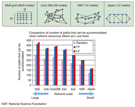 In addition to the LF and FF algorithms, a random algorithm (which randomly selects allocable wavelengths) can be used. The results of a comparative evaluation of the three algorithms—on the basis of the number of paths that can be accommodated in relation to network configuration (i.e., scale)—are shown in Fig. 5. Over the entire network scale range, the number of paths that can be accommodated is largest when the LF algorithm is used. It can thus be concluded that the LF algorithm can effectively utilize network resources to the maximize extent possible.