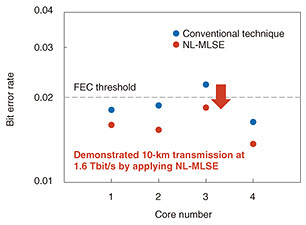 We successfully conducted a field-ambient optical-transmission experiment over 10 km of an ultrafast IM-DD signal exceeding 1.6 Tbit/s per fiber by executing 4-parallel SDM transmission at 400 Gbit/s per lane using a field-installed multi-core fiber and reducing the bit error rate by applying NL-MLSE to the PAM-8 system (Fig. 7).