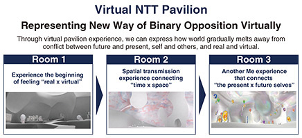Feature Articles: NTT R&D at Expo 2025 Osaka, Kansai, Japan Vol. 23, No. 10, pp. 39–44, Oct. 2025. https://doi.org/10.53829/ntr202510fa4 Another Me Planet—An Alter Ego That Shows Potential Future SelfAbstractAt Expo 2025 Osaka, Kansai, Japan, a Virtual Expo was held where visitors could experience the event 24 hours a day. The Virtual NTT Pavilion provided content linked to a real venue in Yumeshima, Osaka. The pavilion also provided Another Me Planet, which enables people to communicate with themselves in future occupations and realize their potential so that they can experience the world view of Another Me™, a theme of the real venue. This article introduces Another Me Planet and the technology to achieve it. Keywords: Another Me, speech synthesis, large language model 1. Virtual NTT Pavilion linking real and virtualIn addition to a real venue in Yumeshima, Osaka, NTT also exhibited a virtual pavilion at the Virtual Expo of Expo 2025 Osaka, Kansai, Japan [1], which consisted of three different venues (Rooms 1, 2, and 3) in conjunction with the real venue (Fig. 1).