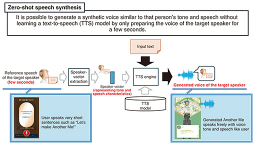 We are adding the necessary elements to Another Me so that users can feel like it is more like themselves. We take advantage of the surface layer to make the voice that Another Me speaks more like the user’s, i.e., not simply focusing on appearance. The content that Another Me talks about is determined on the basis of the characteristics of the user. We are using the following technologies under research and development at NTT laboratories to achieve this. 4. Technologies that make up Another Me in Another Me Planet4.1 Zero-shot text-to-speech synthesis technologyIn Another Me Planet, users record a few seconds of their voice then listen to messages from their “future self” in a career of their choice, with the voice reflecting the user’s unique vocal characteristics. This audio is generated using one of the latest features of NTT laboratories’ text-to-speech synthesis technology [3]: zero-shot speech synthesis (see Fig. 5).