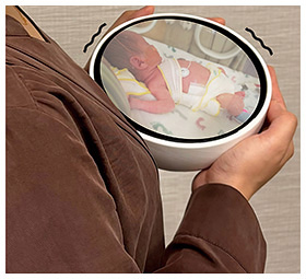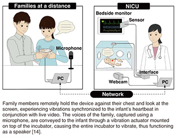 3. Modulation of affiliation through embodied information transmissionSuch emotional interactions are particularly likely to occur between close partners [5], as they reflect the sense of unity and strength of connection between individuals, and are therefore believed to play a significant role in human relationships [7]. One study reported that physical touch can enhance emotional interactions [8]. In this study, researchers compared conditions under which romantic partners held hands while one of them was experiencing pain versus conditions without hand-holding. They found that holding hands strengthened the synchronization of physiological emotional responses, such as respiration and heart rate. In other words, physical contact with a partner appears to promote unconscious bodily resonance, including physiological linkage. The study also showed that in couples with stronger synchronization of emotional responses, the presence of a partner holding their hand alleviated the perception of pain. These findings suggest that physical touch may enhance bodily resonance and deepen the sense of comfort provided by a partner’s presence. If one could receive information about a partner’s unconscious bodily responses—hereafter referred to as embodied information—through direct physical contact, would this change their sense of connection and affiliation with the partner? Using a device developed by NTT Communication Science Laboratories that simulates the sensation of another person’s heartbeat [9], we designed an experiment where participants were paired with a stranger online. This device reproduces recorded heart sounds via a “heartbeat box” containing a vibration speaker. Participants were assigned to one of two groups: in the first group, they held the heartbeat box with both hands while watching a live video of the partner and felt the vibrations of their heartbeat; in the second group, they only watched the video. Results indicate that participants under the heartbeat condition reported a greater sense of psychological closeness to their partner [10]. 4. Applications for remote family communicationOn the basis of previous experimental evidence that transmitting embodied information as tactile vibrations can contribute to strengthening feelings of affiliation, we have launched a collaborative research project with Iwate Medical University to apply this technology to simulate heartbeat vibrations and support remote communication between physically separated family members. Japan is recognized as having one of the highest standards of perinatal care among developed countries. Infants born before 28 weeks of gestation—referred to as extremely preterm infants*2—have the highest survival rates in the world in Japan [11]. Babies born prematurely or with low birth weight are typically admitted to neonatal intensive care units (NICUs), where they may require prolonged hospitalizations lasting several months. Such extended stays can limit opportunities for parent–infant physical contact, which has been reported to impact parental mental health and the development of parent–child attachment [12]. To address this, NICUs actively promote practices such as kangaroo care—holding the baby skin-to-skin against the parent’s chest—to support parent–infant bonding even during hospitalization. However, opportunities for in-person visits are sometimes restricted due to measures against high-risk emerging infectious diseases such as COVID-19, as well as practical constraints such as parents’ time limitations (e.g., work or caring for older children) and geographical barriers (e.g., difficulty accessing the hospital). In response to visitation restrictions during the COVID-19 pandemic, many NICUs, including Iwate Medical University Hospital, introduced online visitation systems. Since then, these systems have continued to be used by families who are unable to visit in person frequently due to various circumstances, serving as a supplement to face-to-face visits. Online visitation offers advantages such as enabling siblings and grandparents of the baby to join easily and simultaneously. It is also expected to help alleviate parental anxiety by enabling parents to see their baby and their surroundings. However, it has also been pointed out that some parents experience conflicting emotions—such as a sense of longing from being able to see but not touch their baby and feelings of guilt about not being able to comfort their crying baby [13]. To address this issue, we designed the Embodied Online Visitation System that enables the transmission of family voices to the infant and the delivery of the infant’s embodied information to distant family members. Through this system, family members hold a device against their chest and experience synchronized heartbeat vibrations in real time—matched to the baby’s heartbeats inside the incubator—alongside live video. At the same time, the family’s voices are captured with a microphone and transmitted through a vibration actuator mounted on the incubator, enabling their voices to reach the baby (Figs. 1 and 2) [14]. When a parent speaks to the baby, the audio captured with the microphone is sent over the network to the vibration actuator attached to the incubator frame. By using the vibration actuator, the incubator functions as a speaker, enabling the baby to perceive the family’s voices without the need for placing a speaker inside the incubator. Regarding the baby’s heartbeat, directly acquiring heart sounds would require attaching a stethoscope-type microphone to the baby, raising concerns about placing an additional burden on the infant. To address this, we adopted an approach in which real-time heartbeat information—derived from the electrocardiogram displayed on the bedside monitor—is acquired and used to synchronize a model heartbeat sound, which is reproduced using a vibration speaker embedded in the device, enabling fa