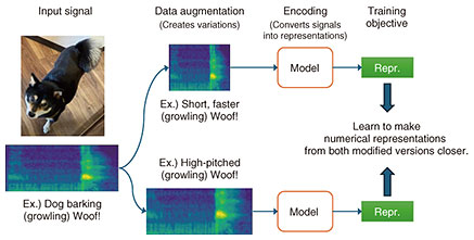 Feature Articles: Exploring Humans and Information through the Harmony of Knowledge and Envisioning the Future Vol. 23, No. 10, pp. 67–72, Oct. 2025. https://doi.org/10.53829/ntr202510fa9 AI that Learns to Listen on Its Own—Advancing Self-supervised Audio Representation toward Cutting-edge Sound Understanding with Large Language ModelsAbstractRepresentation learning”½which enables the extraction of meaningful features from media such as audio and images”½has greatly advanced artificial intelligence (AI)”Ēs ability to understand media content. This article introduces technologies that we developed for learning audio representations that allow AI to comprehend the diverse sounds that surround us. The learned representations can be applied to a wide range of sound applications, such as identifying animal vocalizations or music genres. We focus on self-supervised learning, a form of representation learning that uses only audio data to avoid the labor cost of annotating data, to further develop our technologies. We also extend these technologies by aligning audio understanding with the language semantics, leveraging large language models. Keywords: representation learning, self-supervised learning, sound understanding 1. IntroductionRepresentation learning*1, which enables the automatic extraction of useful features from media content such as audio and images through training, has significantly enhanced artificial intelligence (AI)’s ability to understand such data. This article introduces technologies that we developed for learning audio representations that enable AI to comprehend the various sounds around us. Deep learning*2 models trained through this approach can be applied to a wide range of audio understanding tasks, such as recognizing sounds like human voices and animal vocalizations, or identifying music genres. Among the various representation learning paradigms, self-supervised learning*3 has gained attention as an alternative to conventional supervised learning*4 methods, which require labeled data that indicates the content of each audio clip. Self-supervised learning instead generates training labels automatically from the data itself. This makes it possible to leverage large-scale unlabeled data to learn more robust and effective audio representations. We have been advancing our technologies by employing this self-supervised approach, and our methods have further evolved to align audio with language representations, reflecting the increasing need to handle media content via natural language. We also extended these methods to utilize large language models (LLMs), taking advantage of their powerful semantic understanding of text.
