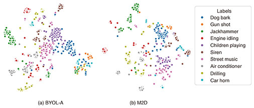 3. BYOL for audio: Learning representations robust to subtle differences in soundAs a first step toward learning effective features for diverse audio, we proposed BYOL for Audio (BYOL-A) [1], a self-supervised learning method based on the image-based technique Bootstrap Your Own Latent (BYOL). BYOL-A learns numerical representations that capture underlying sound patterns while suppressing minor differences. For example, a dog’s bark may vary depending on pitch, loudness, or breed, yet it is generally understood simply as a “bark.” BYOL-A is designed to learn to extract the same representation for such variations when they belong to the same sound pattern, thereby enabling more useful audio representations (Fig. 1). To achieve this, BYOL-A learns representations that are robust to small changes in the audio. Specifically, the model is trained using two versions of the same sound, each modified with random changes in characteristics such as background noise, duration, pitch, and volume. It is then optimized so that the numerical representations from both modified versions match as closely as possible. Therefore, BYOL-A is designed to encourage models to automatically extract meaningful representations that capture the essential characteristics of the sound by training them to produce the same representation even when the original sound is altered in different ways. As a result, this method significantly improved the performance of audio-related tasks—for example, achieving over a 20-percentage-point gain in spoken keyword spotting. This performance gain can be attributed to the learned representations naturally forming clusters of similar sounds across various tasks, making classification much easier (Fig. 2(a)).