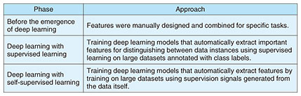 2. Representation learning: Foundational technology for understanding media contentRepresentation learning is a fundamental technology that enables computers to understand media content—such as audio and images—by learning to automatically extract useful features, or representations*5. In the past, features such as loudness, pitch, or frequency components were manually designed using signal processing techniques to suit specific applications. However, this manual approach reaches its limits when it comes to understanding diverse and complex sounds, such as conversational speech, vehicle noises, or animal calls. To address this challenge, deep learning emerged as a solution. Deep learning enables representation learning that can automatically extract the most relevant features for distinguishing between different types of audio, leading to more advanced understanding. In its early stages, deep learning relied on supervised learning approaches that use labeled data. More recently, self-supervised learning has gained attention for its ability to learn representations without the need for labeled data by discovering rich patterns inherent in large-scale datasets. This approach eliminates the high cost of manual labeling by generating supervision signals directly from the data itself, making the training process more efficient (see Table 1).
