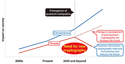 Rising Researchers Vol. 23, No. 10, pp. 14–19, Oct. 2025. https://doi.org/10.53829/ntr202510ri1 Next-generation “Secure Public-key Cryptography” as a Solution to the Rapidly Growing Digital ThreatAbstractTo prevent cyber-attacks, which are rampant on the Internet, encryption of data and communication content has become essential. Quantum computers—said to be 100-million times more powerful than conventional computers for specific tasks—are expected to be put into practical use in the 2030s. As quantum computers become more widespread, the digitalization of society will further progress, and the need for security technologies to support a digital society will also increase. In this interview, we spoke with Fuyuki Kitagawa, a distinguished researcher at NTT Social Informatics Laboratories and leader in research into next-generation public-key cryptography using quantum technology. Keywords: public-key cryptography, quantum cryptography, digital currency Technologies essential for security in the digital environment of the quantum-computing era—First, what kind of research is “secure public-key cryptography”? In today’s rapidly advancing digital society, digitized products and services are now indispensable. As semiconductor technology advances to support faster communication environments, such as fifth-generation mobile communications systems (5G) and 6G, and quantum computers emerge as predicted in the near future, it is highly likely that computing power will continue to increase significantly, and the digitalization of society is expected to progress even more rapidly. For example, the emergence of digital money, as exemplified by train-ticket payments and over-the-internet transactions, has greatly improved the convenience of everyday life. However, these digital currencies and digital transactions have also given rise to many fraudulent uses and crimes unique to the digital world. While the digitalization of society has dramatically improved convenience in many ways, it has also created risks that had not existed. Despite recognizing the convenience of using digital services, users who are more aware of these risks tend to be hesitant to use such services. Digital technology still faces many challenges, and security is an essential challenge to developing it so that it can be used more safely and securely by everyone. One of the most representative methods for protecting digital information is public-key cryptography. Under the expectation that quantum computers will become practical in the 2030s, research on public-key cryptography is currently undergoing a period of transformation. One reason for this transformation is that when quantum computers become a reality, situations will arise in which security cannot be ensured with conventional cryptographic methods. It has already been discovered that encryptions by using conventional public-key cryptographic methods, such as RSA (Rivest-Shamir-Adleman) encryption and elliptic-curve cryptography, can be easily decrypted with quantum computers. This discovery is shocking because RSA encryption and elliptic-curve cryptography are widely used for everything from our email correspondence to transactions by financial institutions. To prevent confusion even if research and development (R&D) on quantum computers is accelerated and quantum computers are suddenly put into practical use, R&D on public-key cryptography that produces encryptions that cannot be decrypted even by quantum computers is currently being pursued. The theme of this research is called “post-quantum cryptography.” As the implementation of quantum computers draws near, researchers are attempting to develop new cryptographic technologies that use the unique properties of quantum computers. As one such attempt, my research aims to use the incredible capabilities of quantum computers, which can even break encryptions by using “secure” encryption methods such as RSA, to develop cryptographic technologies that have hitherto been inconceivable. The theme of this research is sometimes called “quantum cryptography.” The ultimate goal of my research is to use my areas of expertise (cryptography and quantum information) to develop a quantum cryptographic method that will guarantee security—even in the future quantum-computer era—and ensure everyone can enjoy the benefits of a digital society (Fig. 1).