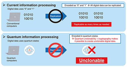 —Specifically, what kind of technological research are you conducting? Towards a secure digital society of the future, I aim to create “unclonable digital information”—even once quantum computers are put into practical use—by combining cryptography and quantum information. Regarding current information processing, all digital information is nothing more than a bit string consisting of a combination of 0s and 1s, and, theoretically, all digital information can be easily copied. We copy files on our personal computers and share photos with friends on social media on a daily basis. The ability to copy such digital information is convenient, but it also poses a risk to digital information. This convenience and risk of digital technology go hand in hand. Once all digital information falls into the hands of malicious users, it becomes a risk that it will be replicated without restriction and spread instantly. Cases of industrial espionage leading to the leakage of important trade secrets and theft of patented technology have been reported, and more familiar cases include the illegal downloading of books and music. A function for notifying the original owner of copies of digital information by other people is not currently available; consequently, the original owners only realize that their digital information or data has been copied and misused after it has been spread. In light of the risks mentioned above, processing using quantum information can eliminate the problems with current information processing and create digital information that cannot be replicated. It will also be possible to analyze information on cases of unauthorized duplication and misuse. With this processing method, digital information is encoded using “quantum states (or qubits)” that represent the state of each quantum bit. Quantum states are unclonable, so it is impossible to devise a technology that can clone any quantum state perfectly. Combining quantum information processing, which involves an extremely large number of states, with cryptography will make it possible to create “unclonable digital information”—namely, information that is cryptographically secure in terms of not only complete cloning but even partial cloning being impossible (Fig. 2).