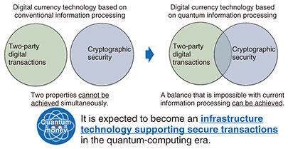 To create this unclonable digital information, I’m conducting research that combines quantum information processing with cryptography. I’m currently focusing on research on unclonable digital currency (quantum money) as an application of quantum information processing (Fig. 3). To date, I’ve proposed methods and related technologies for this digital currency and presented my research findings at major international conferences on cryptography and quantum information, where they have been appraised favorably.
