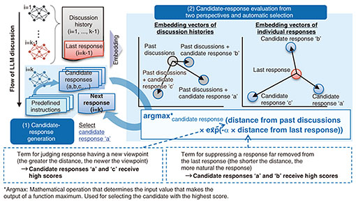 The content of candidate B is near that of past responses and in line with the context of encouraging the elderly to go out, but it is judged to be lacking in novelty. Candidate C includes a completely different viewpoint (i.e., nutrition) and is therefore novel, but it is judged to deviate from the flow of the discussion. Candidate A, however, clearly connects with the immediately previous point of discussion on exercise while presenting a different perspective from going out. For these reasons, it is highly evaluated as a response achieving a good balance between novelty and naturalness, and it is finally adopted. A response having a new viewpoint and flowing naturally with the discussion is automatically selected, preventing simple paraphrasing or repetition and achieving a discussion that evolves in a meaningful way. Since responses are selected on the basis of fixed evaluation criteria, it is expected that the discussion flow will be consistent and be highly interpretable.