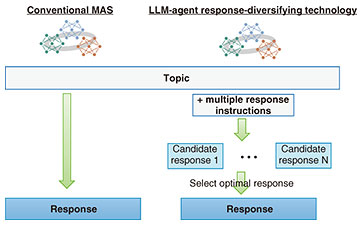 5. Future developments and issuesThis article introduced LLM-agent response-diversifying technology for generating diverse and natural responses in discussions among LLM agents. It was shown that the use of instruction templates and a mechanism for automatically evaluating candidate responses and selecting the optimal one could achieve better performance than the conventional MAS without human intervention. This technology is one of the technical elements that play core roles in discussions within AI Constellation in which LLM agents create a solution from diverse viewpoints. We plan to take on the application of specific use cases and promote research and development on technical issues such as a mechanism for appropriately recording and using past discussions and points of discussion. References