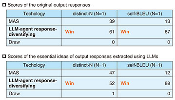 4. Experimental evaluation: Application to brainstorming on preventing the need for nursing care in a local governmentWe applied LLM-agent response-diversifying technology to a brainstorming session on preventing the need for nursing care as one regional issue facing local governments. We set up five LLM agents (e.g., an occupational therapist, welfare coordinator, and a doctor) as stakeholders within a local government and had them discuss and brainstorm about preventing the need for nursing care each from different positions. Within the discussion, we used LLM-agent response-diversifying technology to generate multiple responses and select the optimal one. To assess the effectiveness of our technology, we conducted the following quantitative evaluation. We first held ten discussions under the same topic and LLM-agent configuration for both the conventional MAS and LLM-agent response-diversifying technology, and generated responses for each agent. A response from each agent included not only an idea but also the reason for presenting it. Thus, in addition to the original output responses in each discussion, we also used only the ideas extracted from LLMs from output responses as evaluation targets. The differences between the conventional MAS and LLM-agent response-diversifying technology are shown in Fig. 3. To evaluate whether mutually similar opinions can be suppressed in both the original output responses and their essential ideas, we used distinct-N*6 [3], which measures the text diversity on the basis of the ratio of unique N-grams*7 in the generated sentences, and self-BLEU (Bilingual Evaluation Understudy)*8 [4], which measures similarity between texts on the basis of the BLEU*9 score. We made a total of 100 comparisons in the form of a competition between the conventional MAS and our technology and calculated the number of wins for each result in this competition on the basis of distinct-N and self-BLEU.