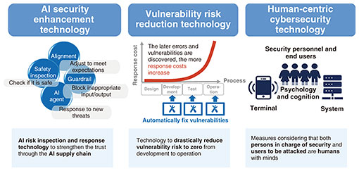 3.1.1 AI security enhancement technologyThis technology enables AI systems to respond to evolving threats. A method for adjusting the AI system (AI model) (alignment) and a method for blocking and controlling inappropriate input/output during the operation of the AI system (guardrail) are effectively combined starting from the safety inspection to enable continuous and timely response. 3.1.2 Vulnerability risk reduction technologyThis technology aims to eliminate the damage caused by exploiting vulnerabilities, from the upstream process of system development to operation. Vulnerability is also a factor in supply chain attacks, and vulnerability countermeasures have become an important issue at the national level since such attacks can bring critical infrastructure to a halt. 3.1.3 Human-centric cybersecurity technologyThis is a technology that evolves security activities from the perspective of the people involved in such activities, centering on collaboration between people and AI. We will create new countermeasure technologies based on the basic premise that both security personnel and end users exposed to threats are people with a mind, which will not only improve security but also improve the experience of security activities. We believe that 20 years of accumulated knowledge and data in the field of cybersecurity will greatly contribute to this research. 3.2 Security R&D for social developmentIn digital transformation, which is expected to be further accelerated due to the evolution of AI, it is important for the owners of diverse digital data in people, organizations, and society to ensure safe distribution and effective use while mutually confirming trust. We are conducting research on digital trust enhancement technologies that enable people to truly rely on information distribution systems and AI. These include technology to control the distribution of digital data throughout its life cycle (generation, distribution, accumulation, utilization, disposal, etc.) on the basis of the wishes of the owners of the digital data and technology to reduce the risk of data leakage and privacy infringement in data processing by enabling different owners of digital data to combine and process them while keeping them encrypted (Fig. 4).