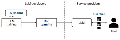 In practical applications of LLMs, special caution is required when using personal data or confidential information for fine-tuning or RAG, regardless of whether the system is intended for external release. If the feature that enables the LLM to temporarily retain past interactions is enabled, there is a risk that sensitive information from those previous conversations could be leaked, so attention must be paid to this as well. Conversely, when an internal LLM is trained only on data accessible to all employees, or when all data are meticulously reviewed to ensure they contain no sensitive information before use, the likelihood of sensitive information being included in the output is eliminated, making it a relatively low-risk approach. 3. Trends in defense methods and research initiatives by NTT Social Informatics LaboratoriesRepresentative defense methods against LLM-specific threats, as shown in Fig. 4, include three main approaches: alignment and red teaming conducted by LLM developers and guardrails implemented by service providers. It is important for LLM developers to properly carry out alignment and red teaming and disclose the results to service providers. As noted earlier, because the level of risk for each threat varies depending on how an LLM is used, service providers must first conduct risk analysis to identify which threats require particular attention. They should then implement necessary guardrail functions—such as measures against jailbreak attacks and sensitive information leakage—on the basis of the identified risks.
