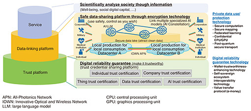 Feature Articles: Security R&D for a Better Future Vol. 23, No. 11, pp. 66–71, Nov. 2025. https://doi.org/10.53829/ntr202511fa8 Toward a Digital-data-enhanced Economy—Information Sharing Driven Using Digital Wallets for Individuals and EnterprisesAbstractWith a view to a digital-data-enhanced economy based on information sharing driven using digital wallets, NTT is researching and developing techniques for ensuring the trust in digital information, achieving encryption/decryption control, and enabling the secure and trusted use of digital data. On the basis of the three pillars of information authenticity, controllability, and security, we aim to develop platform technologies that will enable the use of trustworthy information that protects privacy through a digital identity wallet, decentralized trust, secure computation, etc. Keywords: digital trust, data governance, secure and trusted use of digital data 1. IntroductionA time in which all the information in the world will be digitized is fast approaching. Many human activities, such as shopping, moving about, medical care, education, and entertainment, are now being recorded as digital information in a way that shapes that set of information into our “other selves.” To use such a vast amount of information, a mechanism for sharing data securely while ensuring its trust is indispensable. However, problems exist, such as fake news, a flood of information due to generative artificial intelligence (AI), the hoarding of personal information, and the risk of privacy leaks. With a view to creating a digital-data-enhanced economy in which everyone can use their information and benefit from it, we are developing technology for ensuring trust in digital data together with encryption control and usage management, as the three pillars of trust platform, controllability, and confidentiality for digital data (Fig. 1) [1, 2].