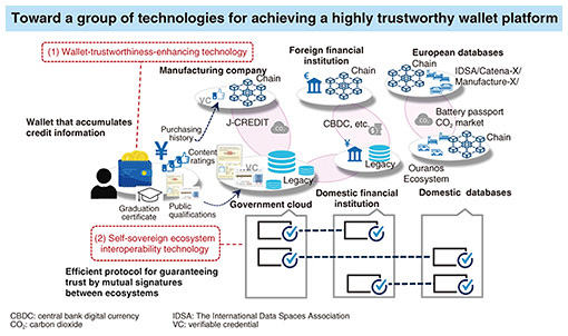 The first is multi-party computation (MPC)-type wallet-trustworthiness-enhancing technology that applies secret-sharing technology. The secure management of private keys required for the presentation, signing, etc. of digital credentials is an element directly related to the trustworthiness of a DIW. However, a system that concentrates such keys on a single terminal or server is vulnerable to unauthorized access, data loss, and other problems. We therefore implement a mechanism that enables users to assign trusted individuals or other devices in key reconfiguration. This mechanism incorporates a social-recovery function in addition to MPC technology that divides a private key into multiple distributed elements and executes a signature in a collaborative manner. It thus achieves both security and convenience. The other elemental technology is self-sovereign ecosystem interoperability technology to facilitate cooperation between ecosystems. In contrast to a single, globally centralized registry, we aim for a structure that would enable mutual authentication and trust building between ecosystems independently constructed by countries or industries. Such a structure would enable diverse stakeholders to participate across different ecosystems and lead to the formation of a decentralized and pluralistic trusted network. Through the above steps and elemental technologies, we seek to create a world of digital information in which authenticity can be guaranteed. Such a world would not simply be one of enhanced security. Our aim is to develop a next-generation Internet platform that substantially redefines what trust means in the information society and enables everyone and AI to safely and efficiently coexist.