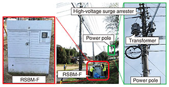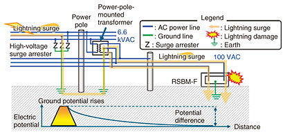 For these three reasons, we proposed that the configuration of the RSBM-F require additional countermeasures against lightning surge. 2.2 Estimation of cause of failureThe propagation route of a lightning surge is shown in Fig. 3. Lightning-occurrence data at the time of the failure of the RSBM-F showed no lightning strikes occurred within a 1-km radius of the RSBM-F. Considering the relative positions of the RSBM-F and the power pole, we estimated that a lightning surge was induced in the pole’s high-voltage power lines and flowed through the high-voltage surge arrester on the power pole to the ground where the surge increased the ground potential [1] around the pole. The increased ground potential then caused the lightning surge to flow back up to the ground line of the power-pole-mounted transformer, propagate along the low-voltage power lines, and reach the RSBM-F.