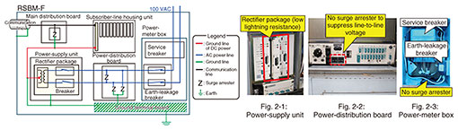 In preparation for the occurrence of higher-voltage lightning surges than that for this failure, installing surge arresters in multiple stages to drain the lightning surge gradually to the ground is also needed. The following three countermeasures were implemented to prevent lightning surges from entering the RSBM-F through power lines. Countermeasure 1: Replace the rectifier package with one that is more resistant to lightning The rectifier package installed in the RSBM-F was replaced with a package with improved lightning resistance (Fig. 5-1). This countermeasure enables the package to withstand a certain level of lightning surge. Countermeasure 2: Install a surge arrester in the power-distribution board to suppress line-to-line voltage A line-to-line surge arrester (countermeasure product: RB-PWN [2] manufactured by Nisshin Electric Co., Ltd.) was installed (Fig. 5-2). This arrester directs lightning surges that would otherwise propagate to the power-supply unit to the ground. Countermeasure 3: Install a low-voltage surge-arrester unit in the power-meter box Low-voltage surge arresters were connected between the power lines and between the power lines and ground line in the power-meter box, and the ground line was connected to the ground terminal board of the RSBM-F (Fig. 5-3). This configuration reduces lightning damage by directing a large lightning surge that enters the RSBM-F from the power lines to the ground. As a result of implementing the above three countermeasures, lightning-surge-induced failure of the RSBM-F no longer occurred. 2.4 Additional countermeasuresAlthough lightning surges entering through communication lines were not the cause of the failure, it is also necessary to prevent possible failures caused by such lightning surges. The propagation route of a lightning surge that enters the RSBM-F through the communication line is shown in Fig. 6. We assumed that a lightning surge that penetrates the communication line will propagate through the main distribution board to the subscriber-line housing unit and damage the subscriber-line packages. It then flows out through the −48-VDC (volts direct current) ground line to the ground terminal board connected to the power-supply unit. The specific countermeasure taken against this type of communication-line lightning-surge damage is as follows.