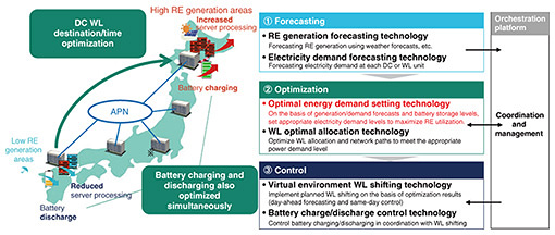 NTT Space Environment and Energy Laboratories is advancing two approaches as technological development to support the regional decentralization and operational advancement of large- and small-scale DCs: decentralized control of DC processing loads based on RE generation status, and DC placement tailored to RE introduction regions. The following sections introduce the specific research content of these approaches. 3. Approach 1: Integrated control of energy and ICT resources for WL distributionAdjusting DC power demand according to RE generation enables supply-demand optimization and expanded RE utilization. For example, during times or in regions with excess RE, shifting processing WL from other DCs enables utilization of this energy. Conversely, during shortages, shifting WL to other DCs can increase RE usage. However, flexibly relocating a DC’s WL is not straightforward. Relocation involves multifaceted constraints such as communication quality, cost, and security. Since both power demand and RE generation fluctuate over time, control must be adapted to the power supply-demand conditions. Thus, to appropriately adjust DC power demand on the basis of RE generation conditions, establishing advanced core technologies and enabling technological collaboration are essential. These include highly accurate forecasting of time-varying DC power demand and RE generation, along with real-time, optimal control of WL allocation between DCs. To address these challenges, multiple NTT laboratories, including our laboratory, are conducting cross-organizational research on integrated energy/information and communication technology (ICT) resource control technology to achieve flexible load control based on RE generation conditions. The overall concept and key technologies are shown in Fig. 2. These key technologies enable the integrated coordination of ICT resources and energy resources such as RE generation and storage batteries across DCs distributed nationwide and connected via the APN. The goal is to effectively use RE and optimize the power supply-demand balance by flexibly controlling DCs’ WL and battery charging/discharging according to RE generation conditions.