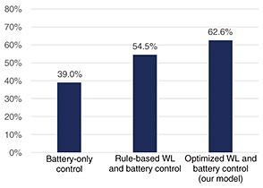 This integrated control consists of three steps: forecasting, optimization, and control. Each step is coordinated and managed by an orchestration platform*1. First, RE generation and power demand at each DC are predicted with high accuracy on the basis of nationwide weather forecasts and historical data. Next, on the basis of these forecasts, the energy demand per DC—including WL and battery charging/discharging volumes—is optimized to maximize RE utilization. The WL deployment plan and network routes for WL shifting to meet this demand are optimized. Finally, on the basis of the obtained optimization plan, WL shifting is executed in a virtual environment, while battery control is executed independently. This enables DC operation that maximizes RE utilization. At our laboratory, we are focusing on the optimal energy demand setting technology. This involves determining the type of WLs to shift, their destination, the amount to be shifted, and the timing of the shift, as well as the charge/discharge levels of batteries co-located with DCs, based on forecasts of the next day’s RE generation and DC power demand. Regarding WL shifting, sending data to DCs in regions abundant in RE via communication networks and executing computational processing can shift power demand, thus potentially resolving the geographical mismatch between RE and power demand. However, WLs requiring high real-time performance (e.g., remote desktops or AI inference tasks) cannot be carried over to the next day, so this does not resolve the temporal mismatch. On the other hand, battery charging and discharging effectively resolves the temporal mismatch between RE and power demand such as charging power from RE and discharging it the following day. However, transferring RE stored in batteries to another DC via the power grid is difficult due to the costs of grid reinforcement and transmission losses, thus does not resolve the geographical mismatch. We are conducting research on an energy demand optimization model that combines these two approaches to simultaneously resolve both geographical and temporal mismatches, thus maximizing RE utilization. This optimization model is based on reinforcement learning, which takes time-series data of RE generation and DC power demand, along with initial battery charge/discharge levels, as inputs. It outputs the optimal amount of WL shifting and battery charge/discharge levels to maximize RE utilization [6]. This model has two key features. First, it defines unique reward functions for the controlled variables—the amount of WL shifting and battery charge/discharge level—and integrates them as a weighted sum, enabling simultaneous optimization of both. The second is that by designing the time window for input data to include forecast values several days ahead, it enables forward-looking decisions. For example, even if the current day is sunny but rain is forecast for the next day, the model can prioritize charging the battery over accepting WL. These features enable the model to output control policies for WL and the battery that maximize RE utilization throughout the year. An example demonstrating the effectiveness of the optimization model through simulations at three DC sites is presented. First, the optimization model was constructed using tens of thousands of patterns of RE generation data—randomly combining sunny and cloudy day solar radiation for 365 days—and a single representative DC demand curve pattern [7] as training data. Simulation conditions were determined on the basis of actual facilities: solar photovoltaic generation was 1.8 MW, maximum DC power consumption was 1 MW, and battery capacity was 5 MWh. These conditions were identical across all three sites. The three sites were selected for their differing climatic conditions: Hokkaido, Tokyo, and Kyushu. Next, we input the 365-day solar radiation data for the three locations and the aforementioned DC demand curve into the constructed model to optimize the amount of WL shifting and battery charge/discharge levels. Finally, we compared the RE utilization rates under three cases: controlling only the battery, controlling the WL and battery with a rule-based model*2, and controlling them optimally with this optimization model. The comparison results are shown in Fig. 3. Compared with controlling only the battery, controlling both WL and the battery with the rule-based model alone improved the RE utilization rate by over 15%. Control with the optimization model confirmed an additional improvement of over 8% in the RE utilization rate. Specifically, compared with the rule-based model that takes into account instantaneous RE utilization rate maximization, this optimization model learned to maximize the RE utilization rate throughout the year. This enabled forward-looking control, achieving a further increase in the RE utilization rate.