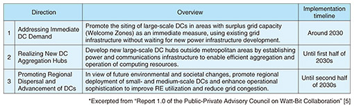 2. The concept and significance of watt-bit collaborationAgainst this background, the concept of “watt-bit collaboration” aims to build a sustainable and efficient social infrastructure by highly integrating energy (watts) and information and communication (bits), thus advancing the development of power and information and communication infrastructure in a unified manner. This concept was proposed in the “GX2040 Vision” presented in February 2025. The Public-Private Advisory Council on Watt-Bit Collaboration, comprising the Ministry of Internal Affairs and Communications (MIC), the Ministry of Economy, Trade and Industry (METI), and power and telecommunication companies, is working to establish policies and implementation approaches for its actualization [5]. On June 12, 2025, as a concrete outcome of these discussions, three key directions were presented, as shown in Table 1. Regarding the first direction, “Addressing Immediate DC Demand,” discussions focused on promoting the siting of large-scale DCs in areas with surplus grid capacity, referred to as “Welcome Zones,” as an immediate countermeasure to power shortages in large-scale DCs in major urban areas such as those represented by cloud-based DCs. Research and development on flexible operation and the establishment of its foundational infrastructure are also being discussed. This includes envisioning the development of next-generation network infrastructure, such as the All-Photonics Network (APN), to achieve both high access performance and energy efficiency for large-scale DCs. The second direction, “Realizing New DC Aggregation Hubs,” envisions establishing core DCs (hubs aggregating multiple large-scale DCs) outside major cities. Discussions focus on selecting new large-scale DC aggregation hubs by comprehensively considering factors such as power infrastructure expansion potential, RE integration feasibility, securing necessary communication infrastructure, transportation accessibility, and disaster risks. The third direction, “Promoting Regional Dispersal and Advancement of DCs,” is positioned as a key measure to enhance the supply-demand balance. Dispersing small-to-medium-scale DCs, such as container-type facilities, in regional areas with high RE potential and improving RE utilization through workload (WL) distribution and control is expected to alleviate grid congestion and reduce output curtailment.