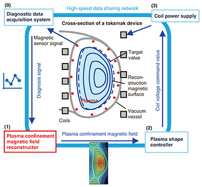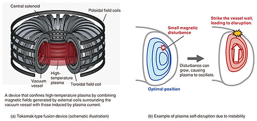 2. AI-based magnetic equilibrium predictionTokamak*3-type fusion devices confine plasma in a toroidal vacuum vessel using magnetic fields, as illustrated in Fig. 1(a). Because plasma is inherently unstable, precise control is essential to prevent displacements that could damage the device (Fig. 1(b)). Particles in plasma at around 100 million degrees Celsius travel at nearly 900,000 meters per second, which means the plasma state must be estimated and controlled within milliseconds. Since high-temperature plasma does not emit visible light, its state cannot be measured directly with cameras. Instead, magnetic sensors*4 surrounding the vessel detect the strength and direction of magnetic fields as electrical signals, which are then used to reconstruct the plasma boundary and shape.