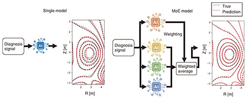 Traditional reconstructions of magnetic equilibrium*5 are based on plasma physics equations such as Maxwell’s laws. While accurate, these calculations can take hundreds of milliseconds, whereas plasma states may change in just several milliseconds. As a result, real-time control*6 systems often approximate only external magnetic fields, even though information about internal profiles is essential for stability analysis. To address this limitation, we apply AI-based reconstruction [2]. Once trained, AI can learn direct mappings from sensor signals to equilibria and predict the plasma state in a single forward computation (Fig. 2). Early attempts using a single neural network achieved reasonable performance under steady-state conditions but lacked accuracy during dynamic changes. To improve robustness, we introduced a Mixture of Experts (MoE)*7 model, in which multiple neural networks are trained under different operating conditions, and a gating network dynamically selects the most suitable experts for each situation.