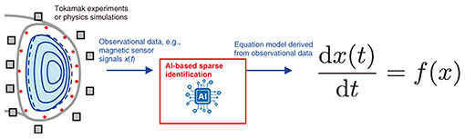 3. Knowledge discovery through sparse modelingWhile AI predictions offer speed and accuracy, they are often treated as black boxes, making it difficult to interpret physical meaning. For fusion research, interpretable models are important both for advancing understanding of plasma dynamics and for designing reliable controllers. Sparse modeling*9, a data science technique that explains phenomena using only a small number of essential terms, addresses this need. We apply a method known as sparse identification*10, with which it is assumed that plasma dynamics can be represented by a differential equation composed of only a few active terms. From experimental data such as temperature and density, we build a library of candidate functions and apply sparse regression to select the minimal set of terms that best describes the observations. To further enhance reliability, we introduce the oracle property*11, which ensures that with sufficient data the correct model structure can be recovered while eliminating unnecessary terms. By combining sparse identification with the oracle property, we extract concise and physically meaningful models from experimental data. When applied to plasma diagnostics, this approach has produced simplified equations that capture essential dynamics while maintaining predictive accuracy. These models are computationally efficient and easy to interpret since each term has physical significance. They also enable real-time controls: equations can be updated continuously from streaming data, allowing for short-term forecasting of plasma behavior and use in feedback control. This workflow is illustrated in Fig. 5. Beyond supporting control, such models provide opportunities to compare with established theories, validate hypotheses, and discover new physical insights.