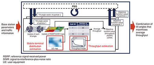 To address these requirements, NTT Network Service Systems Laboratories has developed the Base Station Tilt Angle Calculation AI [1], which automatically derives tilt angles that maximize throughput in the target area. Since the number of tilt angles to be considered is on the order of several hundred, we built a framework using particle swarm optimization (PSO)*1, which enables tilt angle values to be derived with relatively low computational cost (Fig. 2).