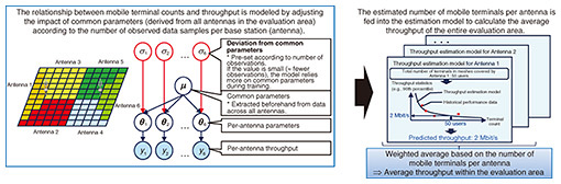 To address this, we established a model that learns both overall trends (including surrounding base stations) and individual base station trends and adjusts the weight given to each according to the number of observation data points. This enables suppression of accuracy degradation in throughput estimation (Fig. 4). With this model, base stations with fewer data points construct models that emphasize overall trends, while those with abundant data emphasize station-specific trends. Throughput can therefore be estimated regardless of the amount of available observation data.