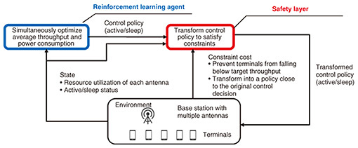 To address this, NTT Network Service Systems Laboratories has developed the Base Station Band Sleep Decision AI, which determines whether capacity-band antennas can be put to sleep on the basis of the utilization rate of each antenna’s radio resources [2]. In current approaches, many AI systems use deep reinforcement learning (DRL)*4 to autonomously learn sleep-decision rules. However, to balance throughput maintenance with power consumption reduction, it is necessary to search for sleep candidates under the constraint that a certain level of throughput must always be guaranteed. Conventional AI models are not able to directly handle such constraint conditions. Our AI extends the DRL-based sleep-decision framework by introducing a safety layer, which transforms the candidate actions derived by the agent into control actions that satisfy required constraints. Thus, capacity bands can be put to sleep while still guaranteeing a specified level of communication quality, reducing power consumption (Fig. 5).