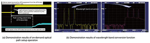 Figure 3(a) shows the demonstration results of the on-demand optical path setting operation. After detecting optical signals from data transceivers at the APN device, the APN controller sets the optical path to the data transceiver, and the data transceiver outputs an optical signal. Figure 3(b) shows the demonstration results of the wavelength band conversion function in Ph-EX. It was confirmed that the optical paths with the C-band wavelengths were set in the single-mode-fiber section, while the optical paths with the L-band wavelengths were set in the dispersion-shifted-fiber section through the wavelength band conversion in Ph-EX. We thus successfully demonstrated two basic technologies: a plug-and-play function that enables users to automatically connect APN devices to the APN wherever and whenever needed and a wavelength band conversion function that enables expansion of APN services using existing infrastructure.
