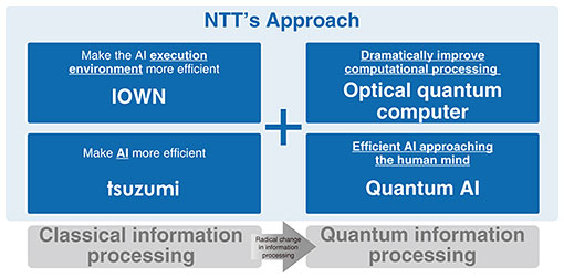 We at NTT are taking four approaches to address this question (Fig. 2). The two approaches on the left in Fig. 2 are within the scope of classical information processing. The IOWN (Innovative Optical and Wireless Network) approach aims to improve the efficiency of the AI execution environment. The other approach uses tsuzumi, a large language model (LLM) that is more lightweight and efficient than other LLMs. We plan to expand the scope of information processing from classical to quantum (Fig. 2, right) to address the above question. These approaches use optical quantum computers, which dramatically improve computational performance, and quantum AI, a highly efficient AI similar to that of the human brain. We address this question by combining these four approaches. With all of this in mind, I would like to share NTT laboratories’ research results on the topics of quantum, IOWN, and generative AI (Gen AI).