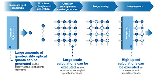 There are three solutions we are investigating to improve the performance of optical quantum computers during these steps. First, the higher the quality of the quantum light source, the larger the amount of high-quality optical quanta (quantum light) can be generated. Second, the more quantum entanglements, the larger the scale of calculations can be executed. Finally, the faster the measurement speed, the faster the calculations can be executed. The actual hardware and software configuration of the optical quantum computer is shown in Fig. 4. Quantum light is first generated from the quantum light source, then quantum entanglements and clusters are generated using optical equipment. Finally, quantum programming and measurements are done using measurement and control equipment. NTT is researching the areas of quantum light sources and measurement/control equipment, where optical parametric amplifiers are used.