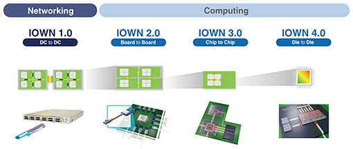 With these features, optical quantum computers offer tremendous scalability compared with other systems for quantum computing and are receiving significant attention worldwide. Everything I have explained thus far has been about a single quantum computer. By placing multiple optical quantum computers worldwide and connecting them through IOWN and all-photonic quantum repeater technology, we believe it will be possible to create a global network of distributed entanglement. Toward this goal, NTT entered into a business partnership with OptQC, a venture company founded by researchers from the Furusawa Laboratory at the University of Tokyo. Together, we aim to build the world’s leading optical quantum computers, with plans to achieve 10,000 qubits in 2027 and 1 million qubits in 2030. 3. IOWN3.1 IOWN roadmapLet me first explain the IOWN roadmap (Fig. 5). In IOWN 1.0, which is in the domain of networking, the goal is to make the connection between datacenters fully optical. From IOWN 2.0 onward, we enter the domain of computing. In 2.0, the aim is to make the connections between sever boards fully optical. In 3.0, the connections between chips on a board become optical. In 4.0, the connections between dies inside a chip become optical.