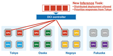 In contrast, with the PEC-2 switch, an optical signal can reach near the ASIC switch. We thus can reduce the distance of electrical wiring to 30 mm, which reduces power consumption. We announced that we will commercialize the PEC-2 switch, the communication capacity of which will be twice that of the protype version, by the end of fiscal year 2026. Toward commercialization, the ASIC switch will be provided by Broadcom; the optical engine, i.e., the PEC-2 device, will be provided by NTT Innovative Devices; and the switch module consisting of these devices will also be manufactured by NTT Innovative Devices. Assembling them into a switch box will be handled by Accton. By combining the PEC-2 switch with GPU servers, we will make optical computing a reality. We are also developing software to support the future operation of GPU clusters. A GPU cluster can be configured with composable servers from Accton, Erut, and Fsas as well as general-purpose GPU servers from Dell and Supermicro. By connecting these GPU servers with the PEC-2 switch, and by using the Data-Centric Infrastructure (DCI) controller, we can optimize and efficiently manage a large number of GPU resources. Let us discuss the example of datacenters distributed across Tokyo, Nagoya, Osaka, and Fukuoka. Not only the unified monitoring of each datacenter’s GPU availability and faults, traffic conditions, and power consumption but also dynamic control will be carried out (Fig. 7). Consider each datacenter has four GPUs. The blue, purple, and yellow GPUs represent those that are already running tasks, and the gray ones are idle. Now suppose four new AI inference tasks arrive. These four tasks do not need to be allocated in the same location, but there is a requirement to prioritize the response time from Tokyo. In this case, the DCI controller will allocate two tasks in Tokyo, one in Osaka, and one in Nagoya (red GPUs in Fig. 7). This allocation is done automatically while monitoring GPU conditions in each datacenter.