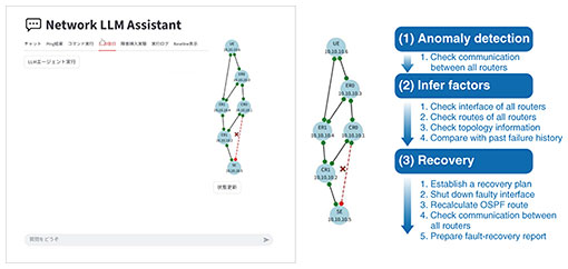 We developed this system in a little under six months. At the early stage of the development, the AI sounded awkward. Because it is a speech-to-speech system, it is quite difficult to control, and there are many examples of failure such as repeating the same question twice and accepting the credit card number the user told even when missing 1 out of 16 digits. Because the system learns conversational patterns, it still cannot handle accuracy requirements well. This is one of the technical challenges. Another challenge is that call centers often receive calls from very angry customers. Professional operators would lower their tone and adjust their response style. How should AI react in those situations? There are still many research challenges that remain. Another application example of Gen AI is network operations and monitoring, which is a core area for NTT. We are now applying AI agents to this domain. Figure 10 shows a network configuration, in which the blue circles represent network devices and lines represent communication links. Say this red link has failed. The AI agent inspects the network, diagnoses the issue, restores the connection, and finally prepares a recovery report. All steps from anomaly detection, inferring factors, and recovery are automated by AI.