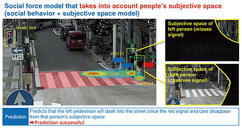4.3 Non-language large-scale modelsWe are developing what we call a large action model. A language model predicts the probability of the next word appearing in text. An action model works in the same manner: after someone performs action A, the probability that they will perform action B is predicted. We built a probability model of actions and applied it to marketing and promotion. For example, based on a person’s past behavior, such as viewing news then seeing an advertisement and receiving reward points, we calculate probabilities for what will happen next if we (i) do not take any promotional measures (ii) send direct mail, or (iii) make a phone call. For instance, when we do not take any promotional measures, the probability of changing a fee plan is 7%, probability of purchasing a smartphone is 1%, and probability of adding an optional video service is 4%. If we send direct mail, the probabilities of changing a fee plan is 8%, purchasing a smartphone is 1%, and adding an optional video service is 4%. If we make a phone call, the probabilities of changing a fee plan is 20%, purchasing a smartphone is 2%, and adding an optional video service is 8%. Since it shows that a phone call is the most effective, we use phone calls for promotion. In fact, when we used phone calls for NTT DOCOMO telemarketing, the order closing rate (number of people accepting offer/number of people called) doubled. A world model refers to AI that understands the world not only through language but also through vision and other sensory inputs. It is sometimes called physical AI and is rapidly gaining attention. We are developing a mobility AI platform together with Toyota. In autonomous driving, it is now said that we must move beyond a self-contained approach that relies only on the car toward a triad of cooperation among people, cars, and infrastructure. At NTT, our research focuses on how to efficiently predict human behavior. Suppose two people are crossing the street at a pedestrian crossing. One person notices a car is approaching and stops while the other is distracted and steps forward and is almost hit by the car. The question is whether AI can predict these two different behaviors in advance. A naïve model makes predictions on the basis of the assumption that physical motion simply continues and cannot predict these two behaviors in this situation. A more advanced social behavior model uses a balance between attractive forces from a destination and repulsive forces from obstacles, such as cars or red lights, and predicts when someone will stop. This model’s prediction also fails. NTT uses a social force model that combines social behavior with a subjective space model (Fig. 11). The person on the right is facing forward and can see the traffic signal while the person on the left is facing in a direction where the traffic signal is not visible and only sees what’s above it. By modeling this difference in what each person perceives in their subjective space, the model predicts their behaviors correctly. A social force model does not treat people as simple physical objects but predicts their behaviors on the basis of social and cognitive factors.