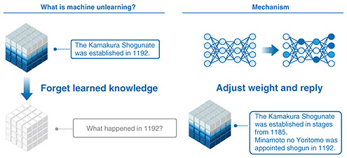 4.4 Research toward artificial general intelligence and artificial superintelligenceThe first topic is Mind Captioning, which was developed by NTT. This technology measures brain activity of a person watching a video or recalling something by using functional magnetic resonance imaging then turns that brain activity into text. When we examined video-identification performance to evaluate Mind Captioning on the basis of similarity scores between the generated text and human-written reference descriptions, we obtained an interesting finding. High-accuracy text generation was possible even when activity in language-related brain regions was excluded from the analysis. This suggests that this technology captures non-verbal semantic information, rather than verbal information, and verbalizes it. If that is true, it might enable us to verbalize what is being seen by measuring the brainwaves of people with damaged language areas, infants who have not yet acquired language, or even animals. We are also conducting research on machine unlearning (Fig. 12). This research focuses on how to make a model forget data it has already learned. It will be useful, for example, when a model is found to have learned data that violate copyrights and someone asks to remove those data. To truly remove them, the model would have to discard that portion of the training set and be retrained from scratch, which is extremely costly. In contrast, machine unlearning enables us to efficiently delete only a specific piece of knowledge from a complete model. If this becomes practical, issues such as copyright problems will become much easier to handle.