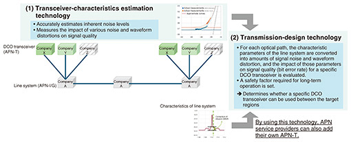 In addition to establishing these technologies, NTT Network Innovation Center (NIC) is also developing an open converged transponder (OCT) that applies these technologies. Two types of OCTs are envisioned: muxponders, which have the transmission function of multiplexing client signals and accommodating them in an APN, and switchponders, which provide L2/L3 functions in addition to the transmission function. OCTs are positioned as transponders that can flexibly accommodate the diverse use cases of the IOWN 2.0 era. 2. Technologies related to muxponders and switchpondersBoth muxponders and switchponders have open interfaces, so they are expected to enable connection with APN interchanges/gateways (APN-Is/Gs) from different vendors. In addition to implementing interfaces that comply with standards, technology to determine whether optical connection is possible at the desktop stage of designing a transmission network is required. As the APN becomes more multi-vendor and increases its coverage, it has become a concern that intermittent faults that cannot be adequately monitored and analyzed using conventional supervisory control will become more apparent, so more advanced monitoring technology is required. These technologies are introduced in the following subsections. 2.1 Open optical-transmission-feasibility determination technologyWhen an APN is being configured, a mechanism to determine in advance whether optical signals can be transmitted from point A to point B without any problems is required. The mechanism that meets that requirement is called optical-transmission-feasibility determination. If devices are connected without determining this feasibility, signals may degrade more than expected while propagating along the communication path in a manner that makes communication impossible or unstable. Conventional optical-transmission-feasibility determination systems have a significant limitation, e.g., the detailed characteristics of the line system (APN-Is/Gs) and transceivers (APN-Ts) are managed internally by the system vendor, and only equipment that the vendor approved as “OK for a certain combination” can be used. Even if it is necessary to change to a transceiver or transponder made by another vendor, the user is effectively left with no freedom of choice, because if a certain combination of APN-Is/Gs and APN-T was not intended by the vendor, it would be impossible to determine whether transmission was possible. This limitation has posed a major challenge for operators wanting to create a multi-vendor network. The idea behind addressing this limitation is open optical-transmission-feasibility determination technology (Fig. 2). This technology can determine transmission feasibility by using common rules and parameters, even if the equipment that makes up the network comes from multiple vendors. The key point is that it can be evaluated openly without relying on optical characteristics that are managed only within a specific vendor.