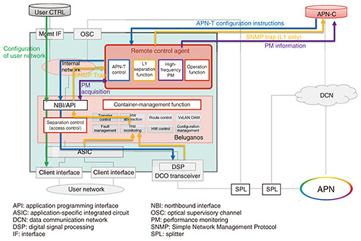 Advances in digital coherent optical technology have led to smaller, more-energy-efficient, and higher-performance transceivers, which can be directly installed in switches and routers as pluggable transceivers. This technology, which integrates dense-wavelength-division multiplexing (DWDM) functionality in routers and switches and connects them directly to an optical network, is called “IP over DWDM.” While a transponder that converts between optical and electrical signals was previously required between routers and transmission equipment, IP over DWDM enables routers and switches to be connected directly to the optical network, thus potentially reducing equipment costs and saving space. Users can also easily connect to the APN by installing transceivers (provided by NTT) in their own routers and switches. One of the reasons that IP over DWDM has attracted attention is the emergence of the OpenZR+ standard. OpenZR+ is a multi-source agreement that integrates the 400ZR standard defined by the Open Internetworking Forum with the open ROADM (reconfigurable optical add/drop multiplexer) functionality, which is widely adopted in optical transmission equipment. It is supported by form factors commonly used in routers and switches, such as QSFP-DD (quad small form-factor pluggable double density) and OSFP (octal small form factor pluggable), and offers flexible data rates from 100 to 400G (providing a reach of up to 600 km for metro-regional applications) and high power efficiency. Currently, 800G OpenZR+-compliant transceivers are available, and hyperscalers and telecommunications carriers are looking to it as a standard that will enable high-capacity, long-distance connections for accommodating the rapid growth in artificial intelligence and cloud traffic. NIC is developing an OCT switchponder that uses a white-box switch; its in-house network operating system (OS), Beluganos [4]; and a 400G OpenZR+-compliant transceiver. Like the OCT muxponder, the OCT switchponder is equipped with functions for open optical-transmission-feasibility determination and high-frequency performance monitoring. It also has a function for separating control authority between the management of Ethernet/IP layers 2 and 3 and the management of APN-T layer 1, so they can be controlled independently. 3.1 Supervisory-control-authority separation technologySupervisory-control-authority separation technology is a function that primarily separates the scope of control over configuration and monitoring of network devices between users and APN service providers (Fig. 5). In conventional optical transmission services, service providers are responsible for optical-path design and operation management in a way that ensures quality. This function enables transceivers to be configured and managed automatically from a controller (APN-C) owned by the APN service provider.